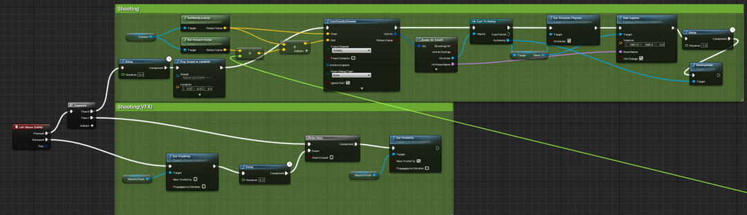 This Blueprint is what does the Shooting action. On the top is the Shooting Blueprint. What it does is it sends out a linetrace and if it hits an enemy, it kills it.The bottom part of the Blueprint is the VFX Blueprint. What it does is, whenever the left mouse button is clicked, it turns on the vfx once and then turns it off once it is released.