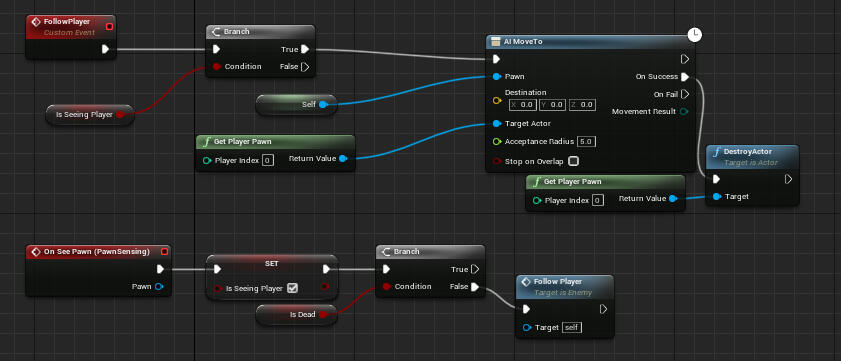 This Blueprint functions once it sees the player. Once it sees the player, the AI moves towards the player until it kills the player or until it gets killed.I used Nav Mesh Bounds Volume which basically is the navigation for the AI.
